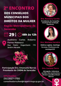 O 2º Encontro de Conselhos Municipais dos Direitos da Mulher da Região Metropolitana de Sorocaba será realizado no próximo dia 29,