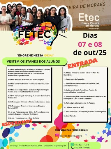 Etec Darcy Pereira de Moraes realiza 11ª FETEC nos dias 7 e 8 de outubro