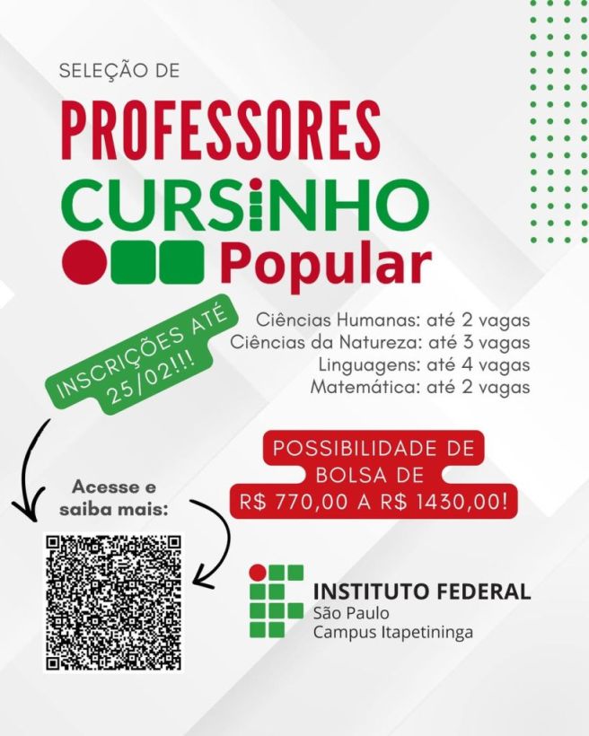 O Instituto Federal de São Paulo (IFSP) – Campus Itapetininga está com inscrições abertas para o processo seletivo de professores que irão atuar no Cursinho Popular 2026. A iniciativa tem como foco a preparação gratuita de estudantes para vestibulares e para o Exame Nacional do Ensino Médio (Enem).